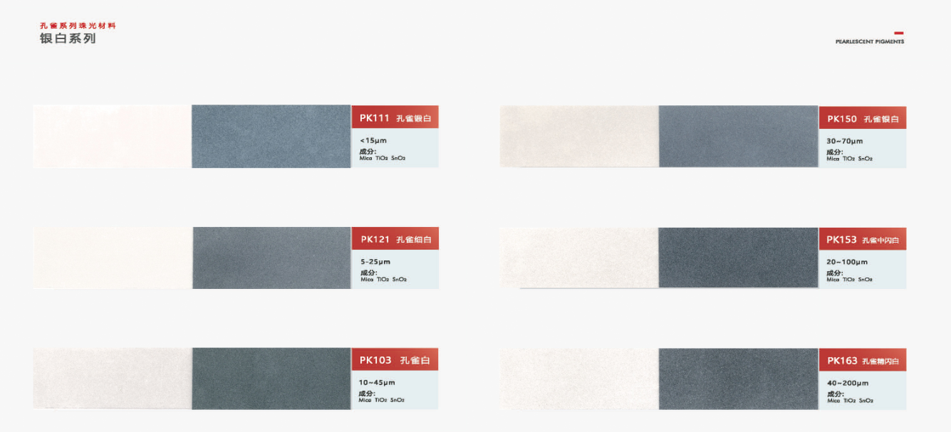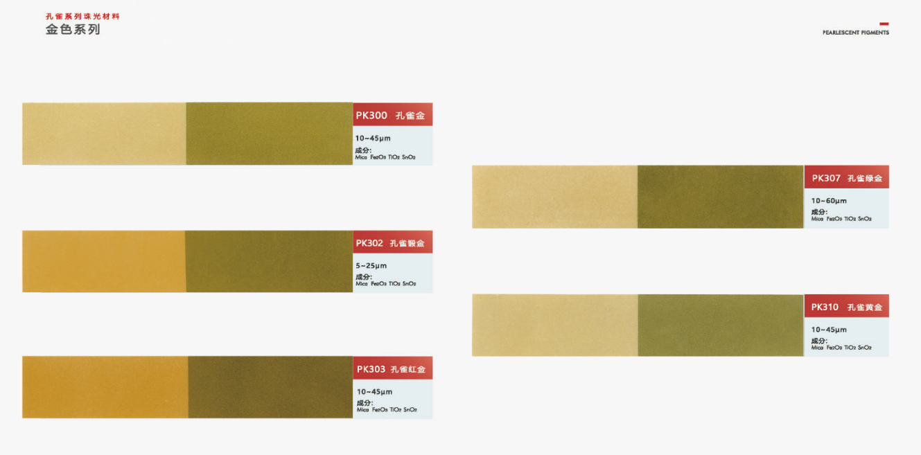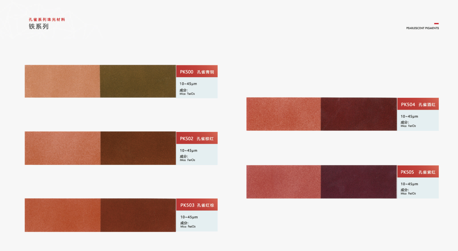 该系列珠光颜料特有的工艺技术造就优质的天然云母基材色系丰富,色彩更加明艳,优良的纯净度保证了宽泛的应用领域。