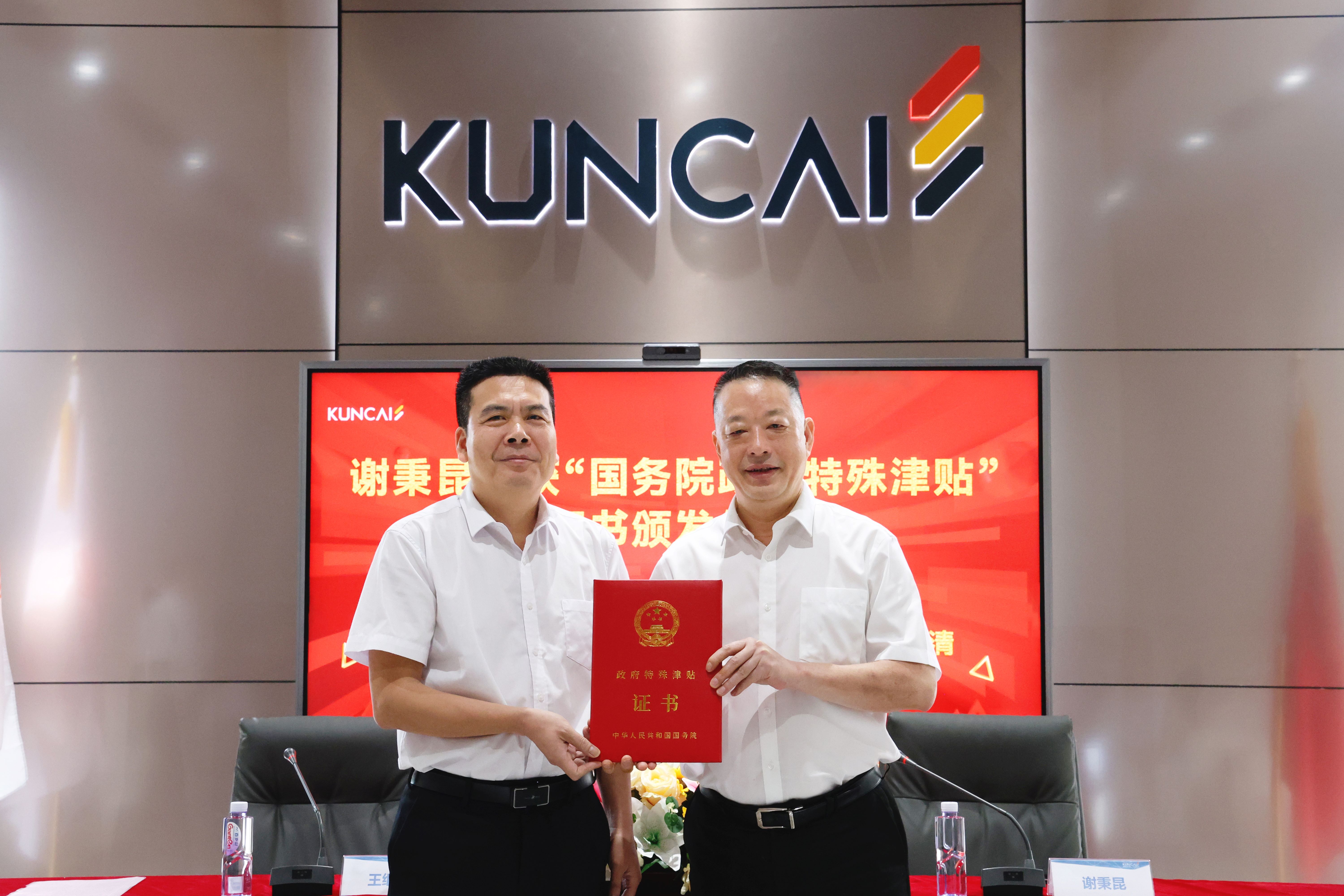 Heartfelt congratulations to Mr. Xie Bingkun, Chairman of KUNCAI, who has been awarded the State Council Special Government Allowance! This national-level honor not only represents the highest recognition from the Central Committee and the State Council for Mr. Xie’s 25 years of dedication to serving the nation through industrial development and his outstanding contributions in leading scientific and innovation, but also marks a milestone in China’s new materials industry’s journey from following to leading the global race.