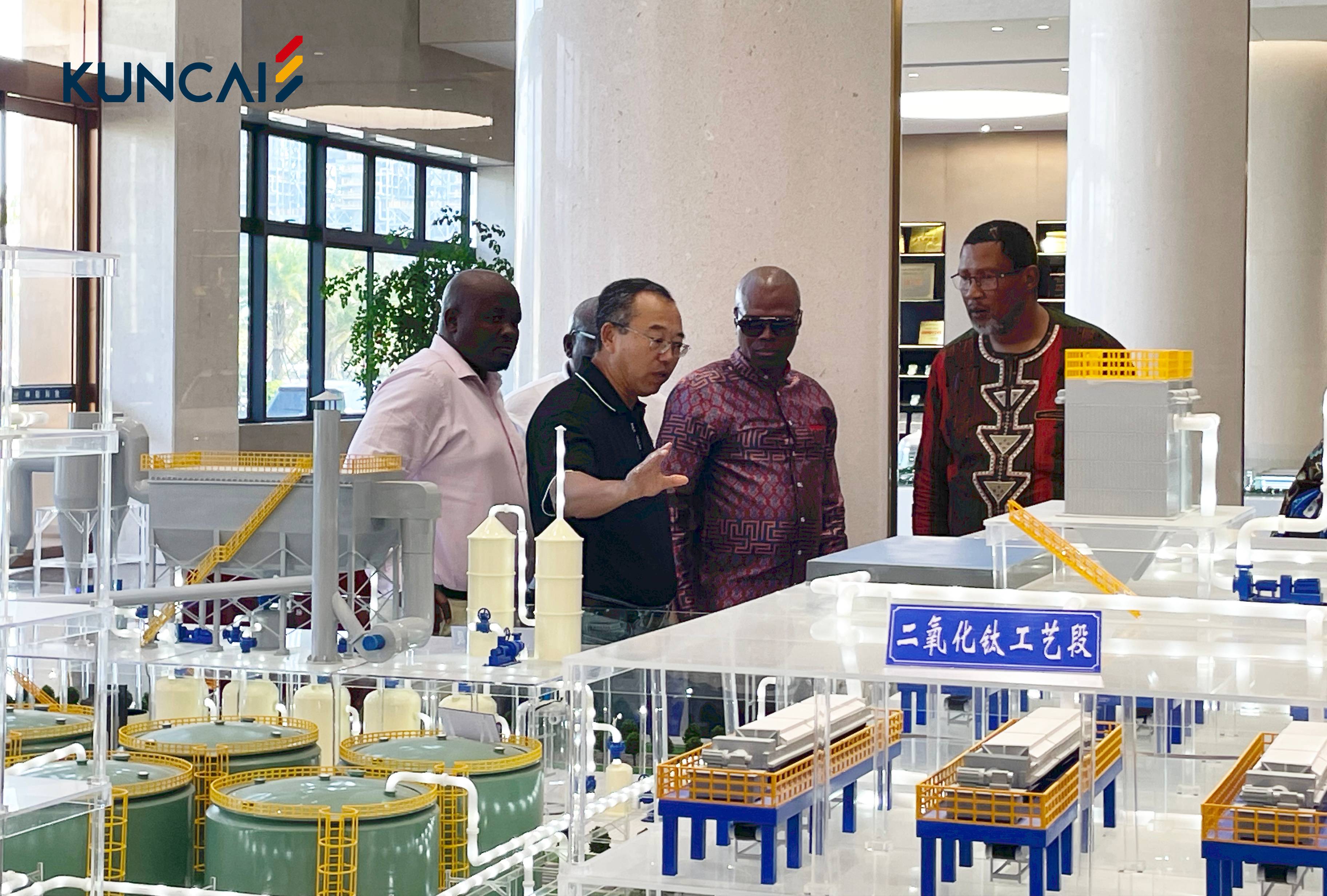 在正太新材厂区,米兰平台技术总监曹志成博士为曼德拉一行详细介绍了坤彩和正太发展规划、厂区布局和生产工艺。就企业自主研发的萃取法氯化钛白生产技术、生产控制系统、销售系统、数字系统、安全管理系统进行全面讲解。